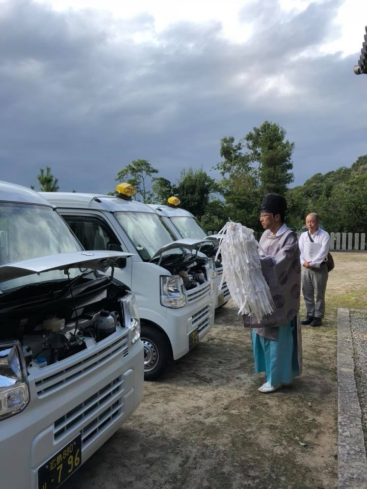 10月6日(土)我が社の新コスモス号三台の交通安全祈願を坂八幡神社で行いました。